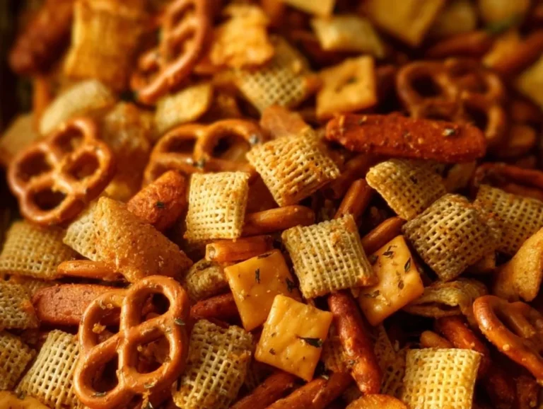A crunchy and cheesy snack mix featuring cereals, pretzels, and spices, finished with rich cheddar cheese for a flavor-packed treat.