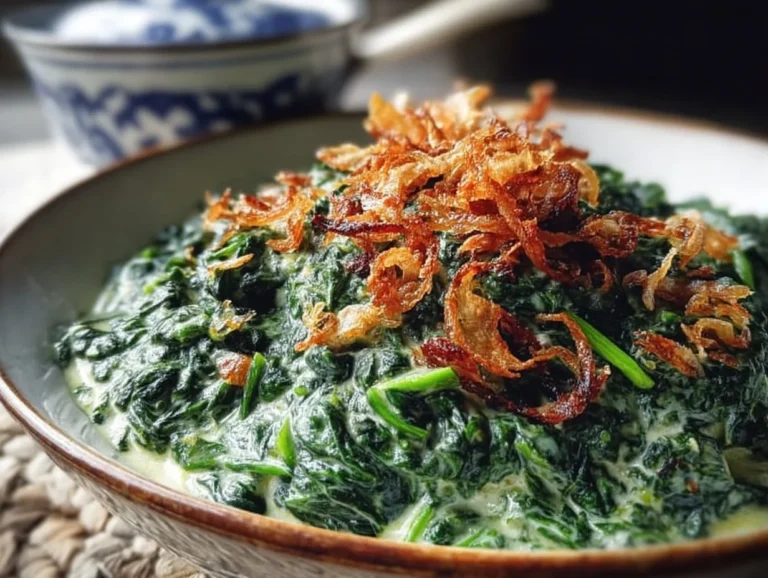 I will never forget the first time I made this creamed spinach with fried shallots. The aroma of garlic sizzling in butter mixed with the bright green of fresh spinach brought me back to my grandmother’s kitchen. Creamy, decadent, and full of flavor, this dish is not only quick to prepare but is also a delightful addition to any meal. If you think spinach is boring, this recipe will change your mind!