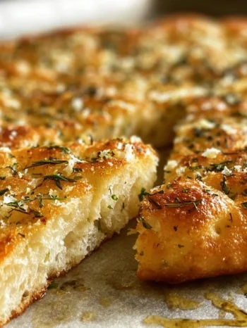 A delightful homemade focaccia bread, crispy on the outside and fluffy on the inside, infused with garlic and parmesan flavors.
