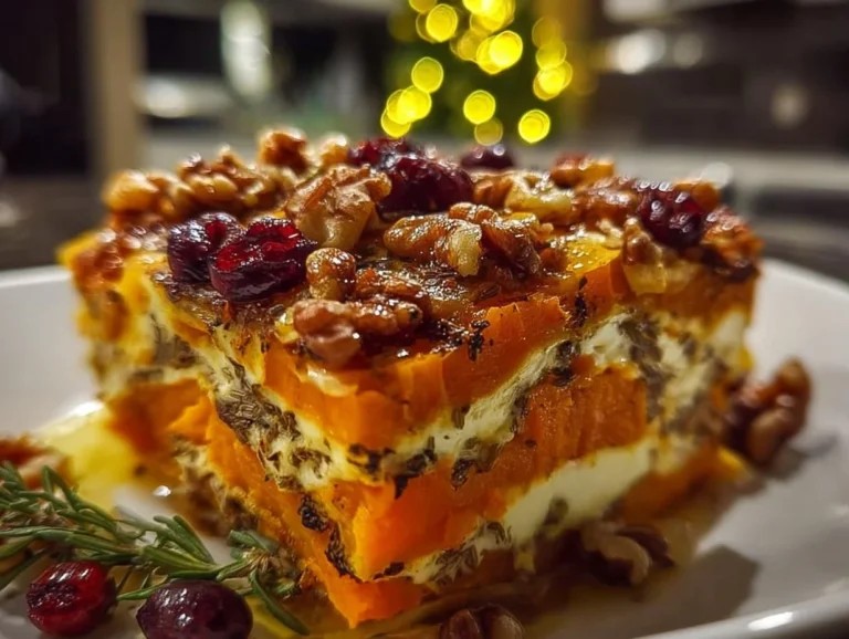 Layered Sweet Potato, Butternut Squash & Carrot Lasagna with Feta, Walnuts, and Cranberry-Honey Glaze
