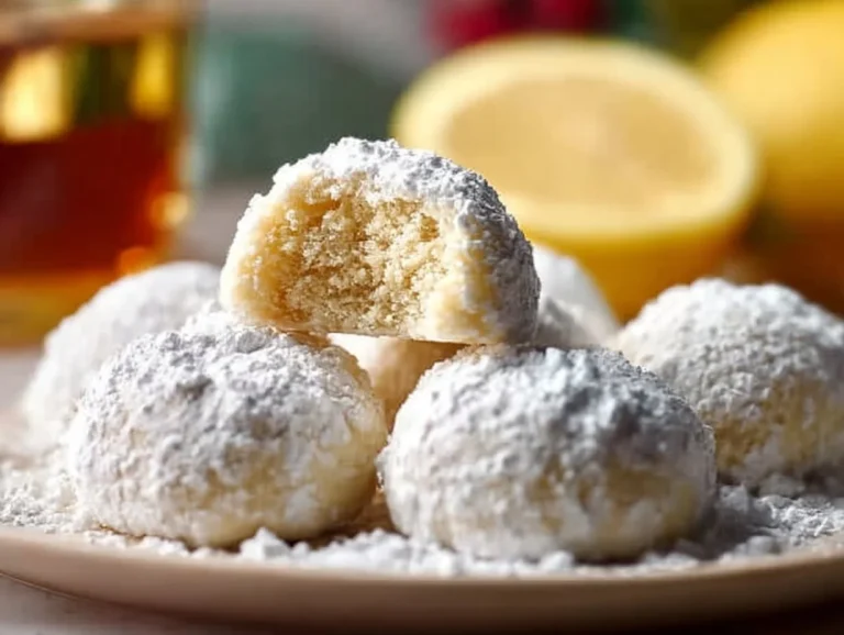 Indulge in the zesty sweetness of Lemon Cream Snowball Cookies with a soft, crumbly texture that melts in your mouth, finished with a dusting of powdered sugar.