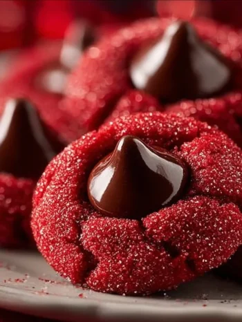 Indulge in these soft, chewy Red Velvet Blossom Cookies topped with a molten Hershey’s Kiss, perfect for celebrating any festive occasion.